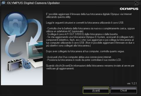 Per aggiornare il firmware delle fotocamere e videocamere digitali Olympus è necessario utilizzare il software "Olympus Digital Camera Updater" fornito dal produttore al momento dell'acquisto, in alternativa puoi scaricarlo cliccando direttamente su questo link.